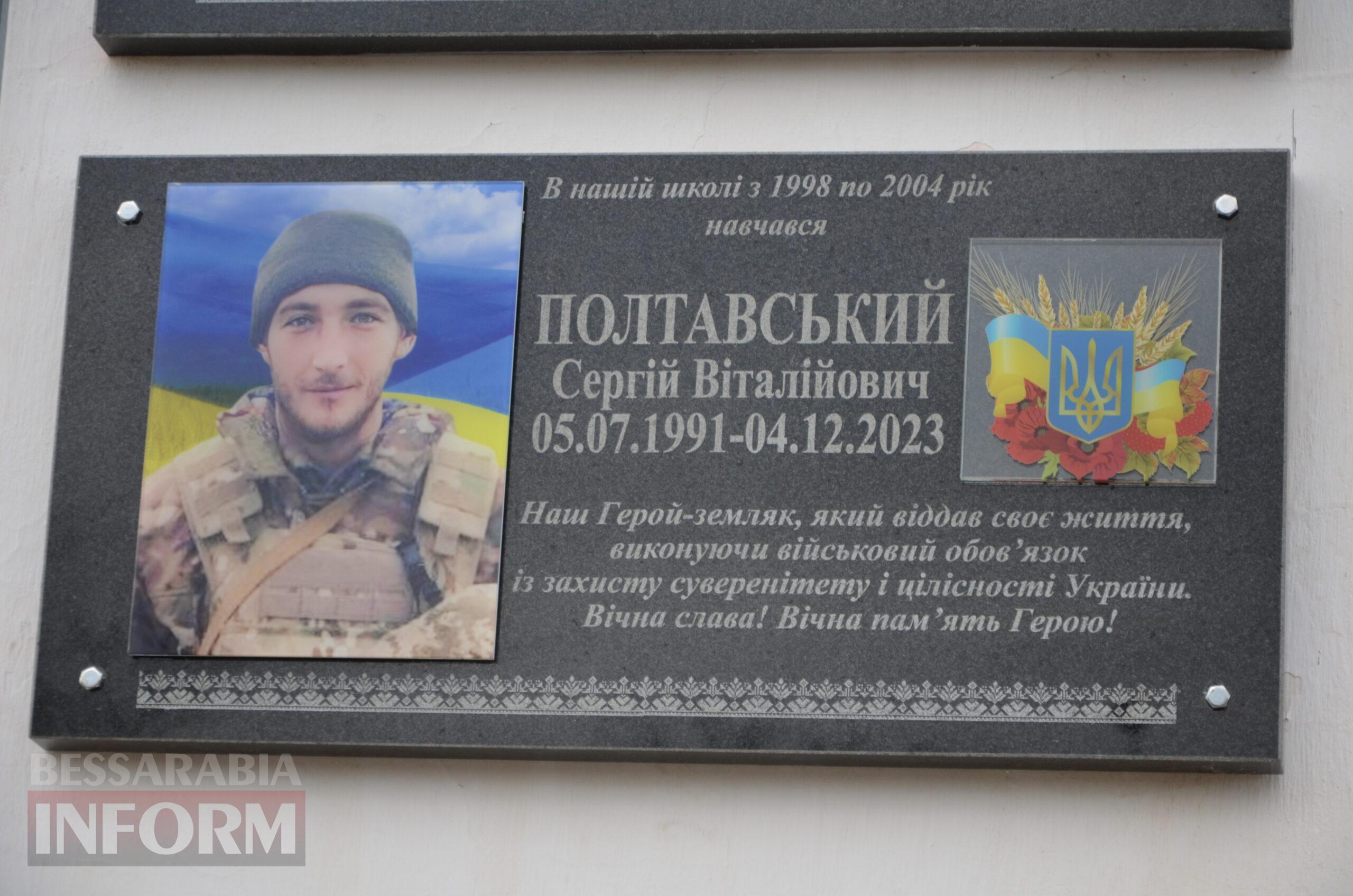 Сьогодні, 4 грудня, в Українському ліцеї імені Тараса Шевченка міста Ізмаїл відбулося урочисте відкриття меморіальної дошки захиснику України Сергію Полтавському, гранатометнику механізованого батальйону, який загинув, захищаючи незалежність рідної землі та свободу Української держави. Про подію розповідає «Бессарабія INFORM».